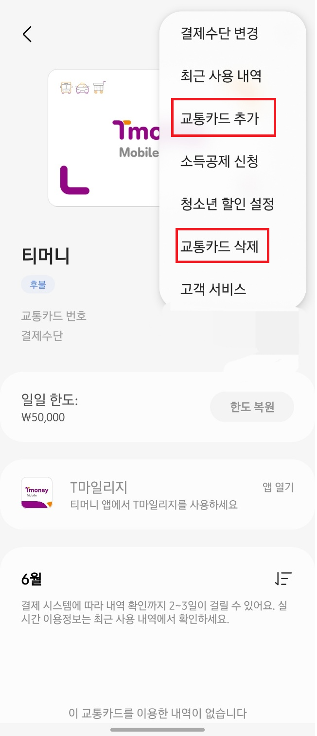 3. 교통카드 추가 선택 / 교통카드가 이미 등록 되어 있는경우, 교통카드 삭제 후 다시 등록