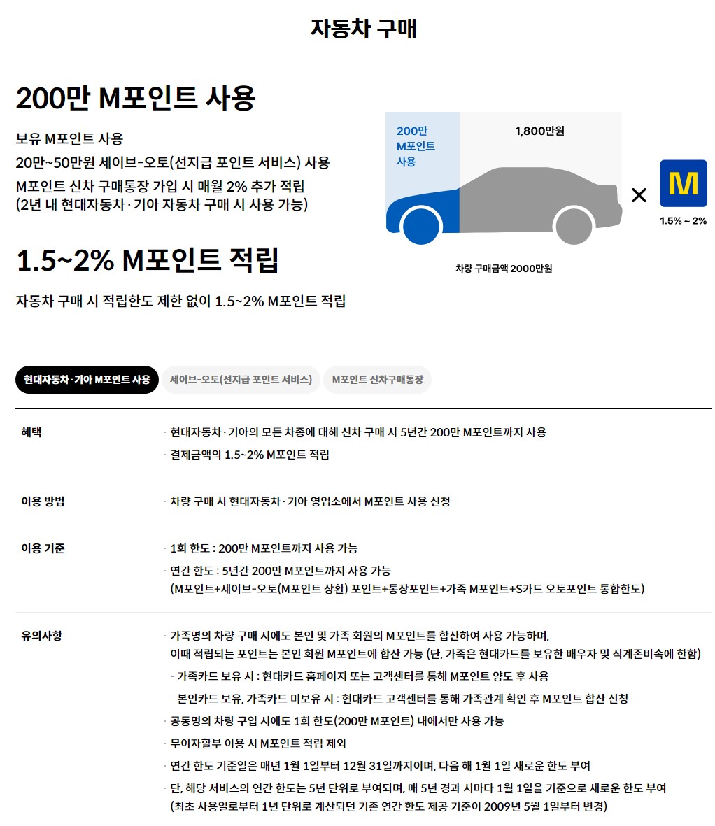 현대자동차나 기아자동차를 구매하실 예정이라면 자동차 구매 시 5년간 최대 200만 M 포인트까지 사용하실 수 있습니다. 포인트가 없으신 분들은 포인트를 선지급 받은 뒤, 매달 적립되는 M포인트로 상환할 수 있는 서비스도 있습니다. 또한 가족 중 M포인트를 사용하고 계신 분이 있으시다면 가족합산도 가능하니 신차 출고 계획이 있으신 분들은 혜택 확인하셔서 꼭 누리시기 바랍니다.