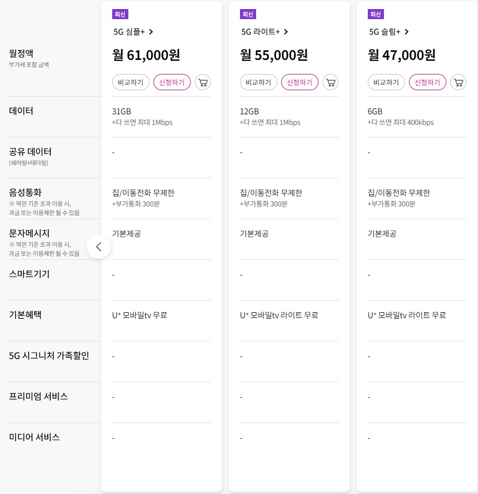 | 5G 심플+ | 61,000원 | 31GB +다 쓰면 최대 1Mbps |