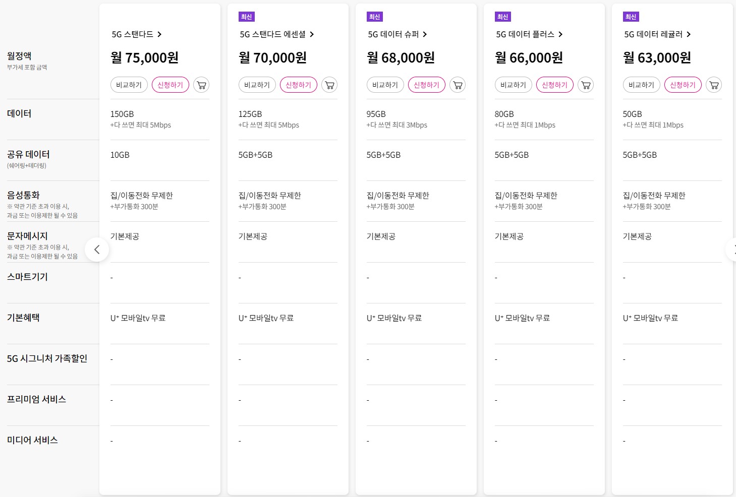 | 5G 스탠다드 | 75,000원 | 150GB +다 쓰면 최대 5Mbps |