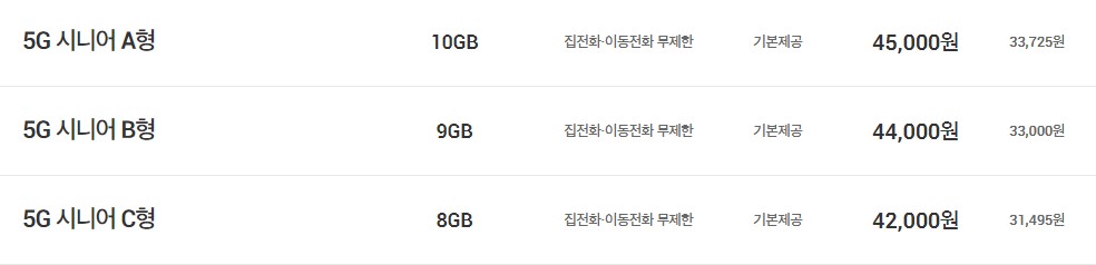 5G 시니어 A형 | -5G 데이터 10GB -만 65세 이상 고객님 가입 가능 -집전화, 이동전화 무제한 -부가통화 400분 |